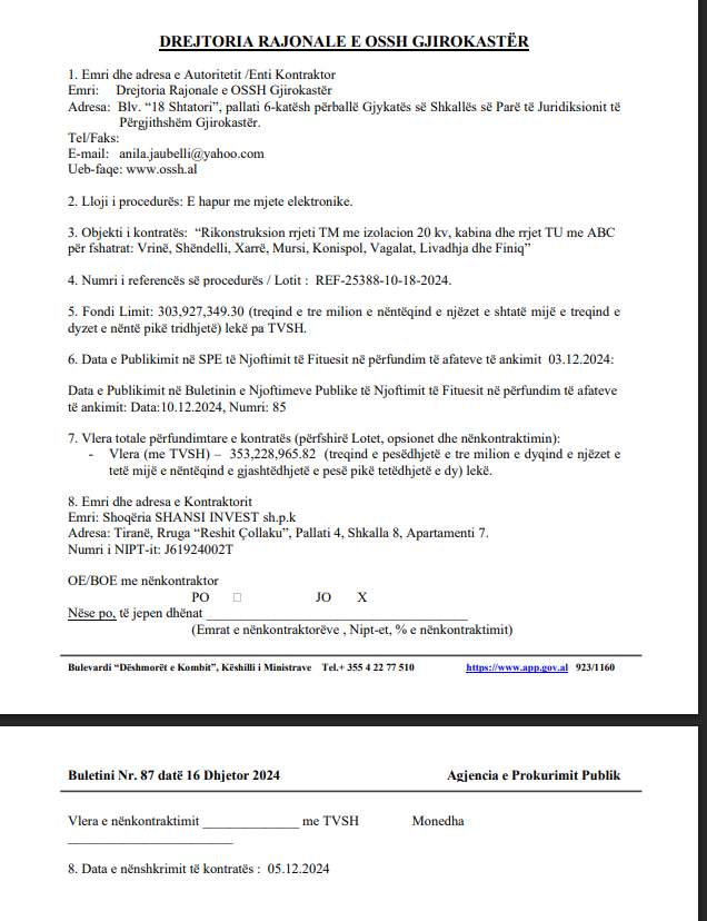 | Autoritet Prokurues | Drejtoria Rajonale e OSSH Gjirokaster | Objekti i Tenderit | Rikonstruksion rrjeti TM me izolacion 20 kV, kabina dhe rrjet TU me ABC për fshatrat: Vrinë, Shëndëlli, Xarrë, Mursi, Vagalat, Livadhja dhe Finiq. | |